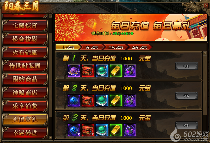 2.连续充值达到3天,奖励翻倍领,更可领取暗影晶石、地狱晶石、雷霆装备等贵重物品