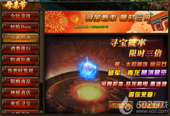 1.活动期间,玩家寻宝概率翻倍,极高几率获得星·太初首饰,特戒钢纹、仙元石、碧落星空,传世灵器、传世灵甲,封神秘法书页以及破军·青龙