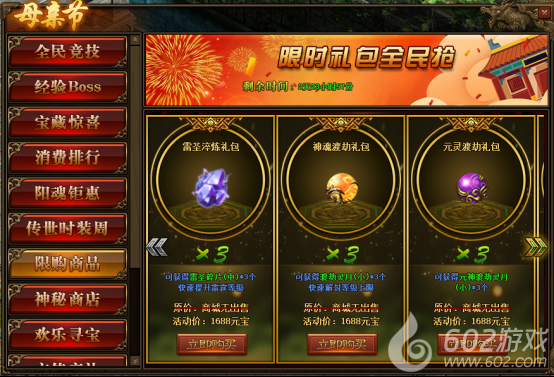 1.活动期间,玩家可在活动面板购买限购商品;(可翻页)