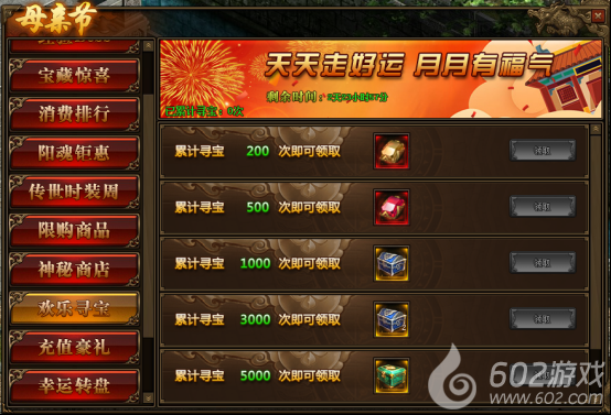 1.活动期间,玩家累计寻宝次数满足要求,可以领取高级天魂石等相应奖励;
