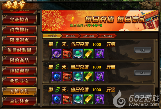 2.连续充值达到3天,奖励翻倍领,更可领取暗影晶石、地狱晶石、雷霆装备等贵重物品