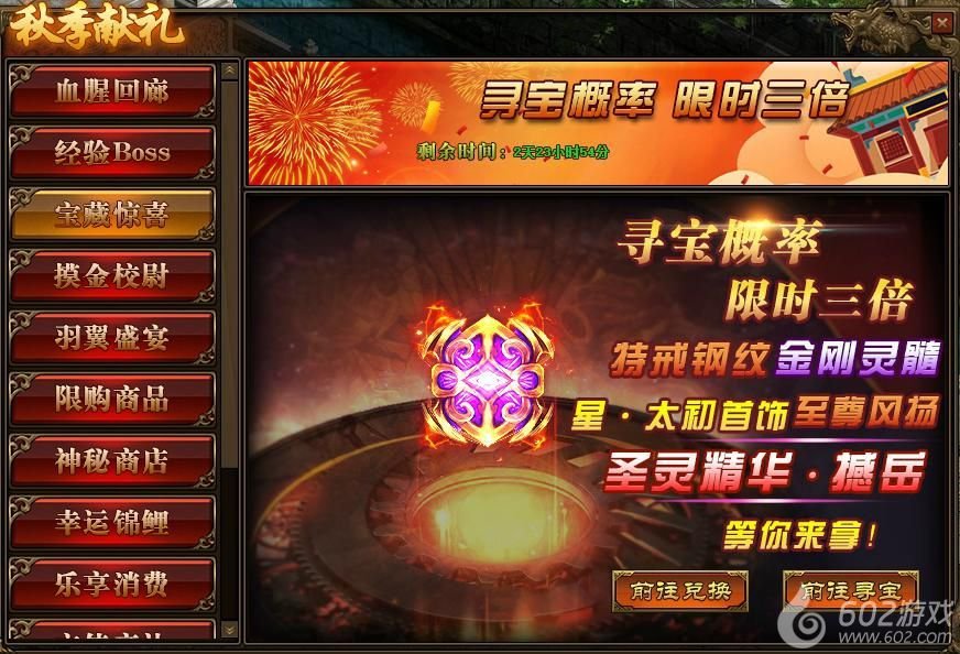 1.活动期间,玩家寻宝概率翻倍,极高几率获得星·太初首饰,传世灵器、传世灵甲,特戒钢纹,仙元石、碧落星空,传世灵器、传世灵甲,金刚灵髓、金刚精华,至尊风扬阵法以及圣灵精华(撼岳)