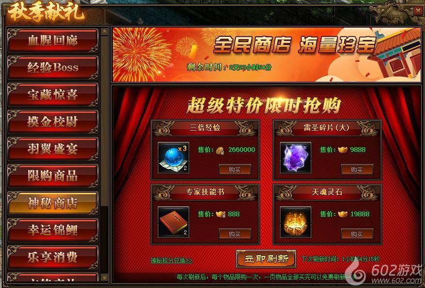 2.神秘商店每2小时自动刷新一次,也可用花费元宝立即刷新;