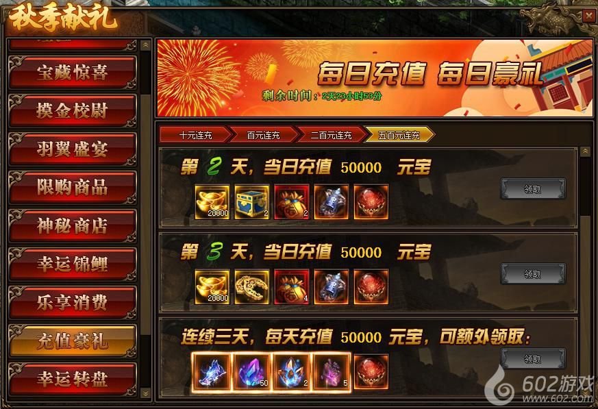 2.连续充值达到3天,奖励翻倍领,更可领取暗影晶石、地狱晶石、随机7级阵法宝珠、雷霆装备等贵重物品