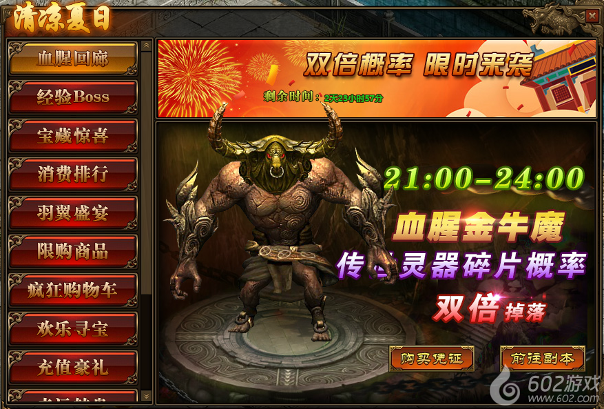 1.活动期间,玩家参与“多人副本-血腥回廊”,获得“传世灵器碎片”的概率翻倍;