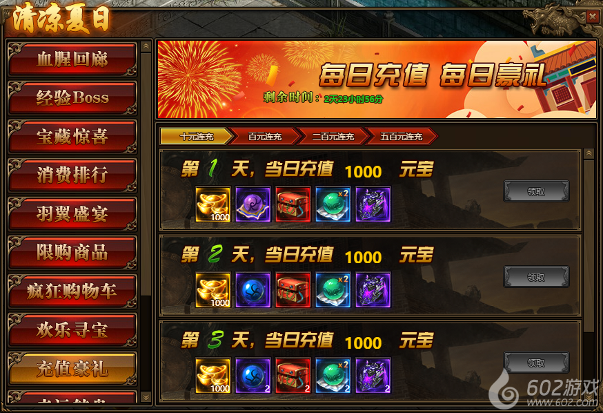 2.连续充值达到3天,奖励翻倍领,更可领取暗影晶石、地狱晶石、随机7级阵法宝珠、雷霆装备等贵重物品