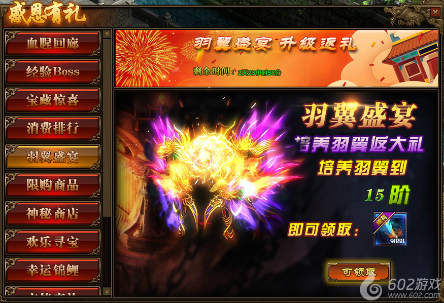 1.活动期间,玩家羽翼只需达到5级,即可领取一定数量的羽毛;