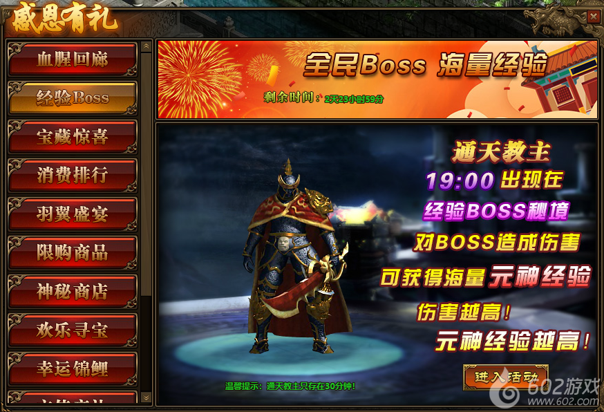 2.活动中,玩家对BOSS造成的伤害,将在活动结束后转换成元神经验并发放;