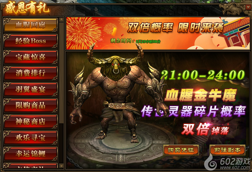 1.活动期间,玩家参与“多人副本-血腥回廊”,获得“传世灵器碎片”的概率翻倍;