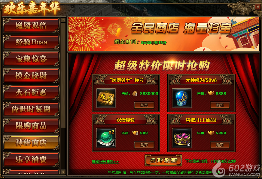 2.神秘商店每2小时自动刷新一次,也可用花费元宝立即刷新;