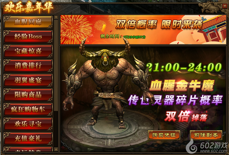 1.活动期间,玩家参与“多人副本-血腥回廊”,获得“传世灵器碎片”的概率翻倍;