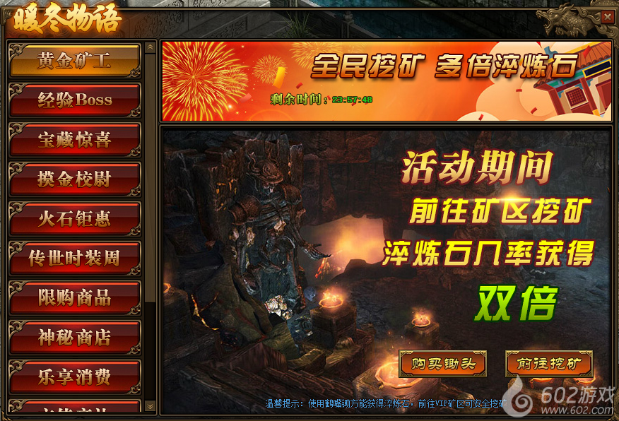 2.注意:必须使用“鹤嘴锄”才可获得“淬炼石”,在VIP矿区可安全挖矿;