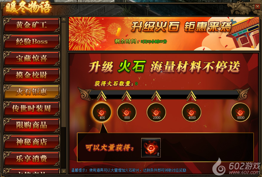 1. 活动期间,玩家获得火石碎片数量,达到条件可领取对应火石碎片奖励。