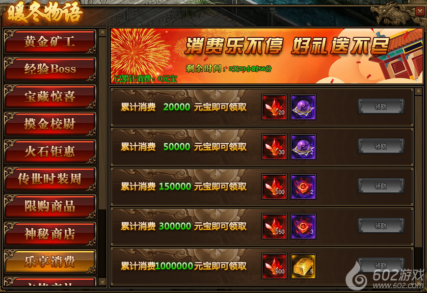 1.活动期间,玩家累计消费满足要求,可以领取境界修为、本职业星石、传世灵戒等相应奖励;