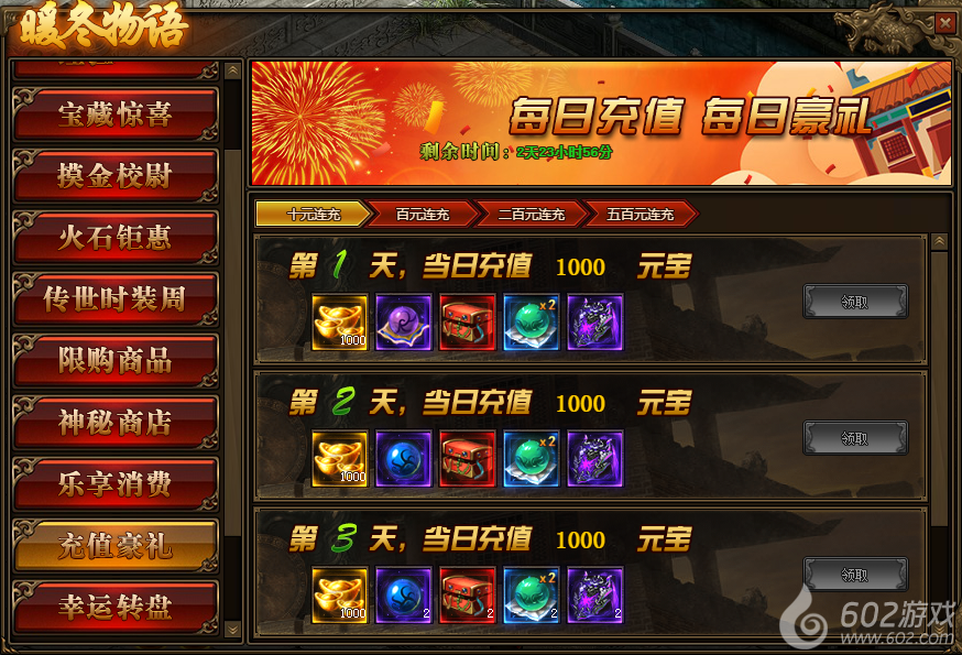 2.连续充值达到3天,奖励翻倍领,更可领取暗影晶石、地狱晶石、觉醒晶石等贵重物品