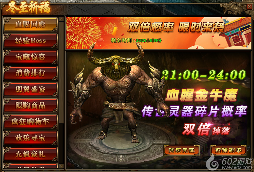 1.活动期间,玩家参与“多人副本-血腥回廊”,获得“传世灵器碎片”的概率翻倍;