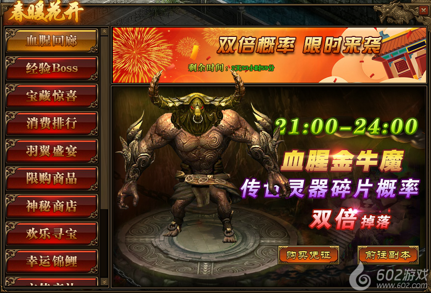 1.活动期间,玩家参与“多人副本-血腥回廊”,获得“传世灵器碎片”的概率翻倍;