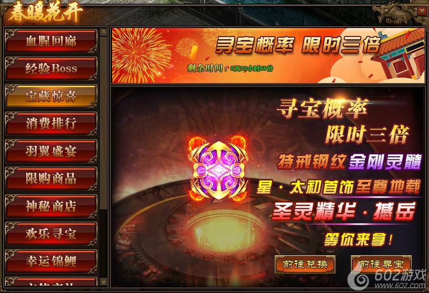 1.活动期间,玩家寻宝概率翻倍,极高几率获得星·太初首饰,传世灵器、传世灵甲,特戒钢纹,仙元石、碧落星空,传世灵器、传世灵甲,金刚灵髓、金刚精华,至尊风扬阵法以及圣灵精华(撼岳)