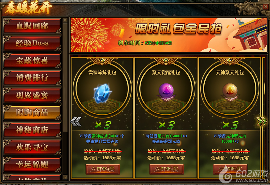 1.活动期间,玩家可在活动面板购买限购商品;(可翻页)
