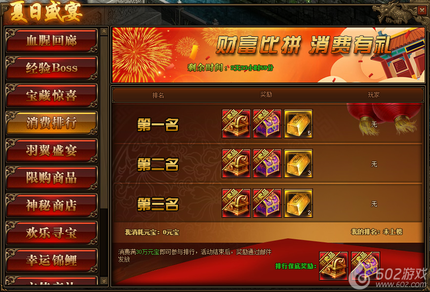 第二名:数一数二自选宝箱,低级灵器自选宝箱*1*1,金条(300w)*3;