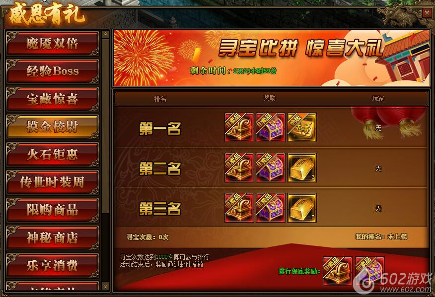 1.活动期间,玩家寻宝次数达到1000次即可参与到摸金校尉排行榜中