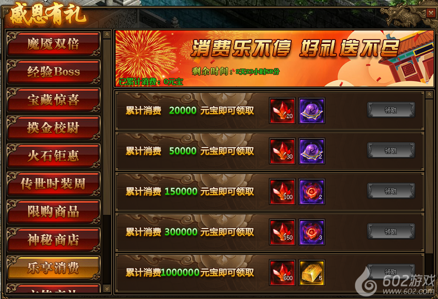 1.活动期间,玩家累计消费满足要求,可以领取境界修为、本职业星石、传世灵戒等相应奖励;
