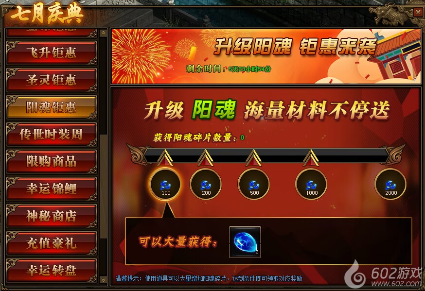 1.活动期间,玩家获得阳魂碎片数量,达到条件可领取对应阳魂碎片奖励。