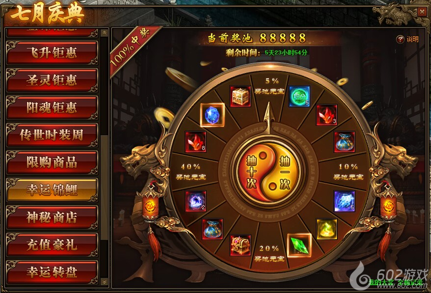 1.活动开启后奖池内默认存入88888元宝,每抽奖1次可使奖池内增加100元宝