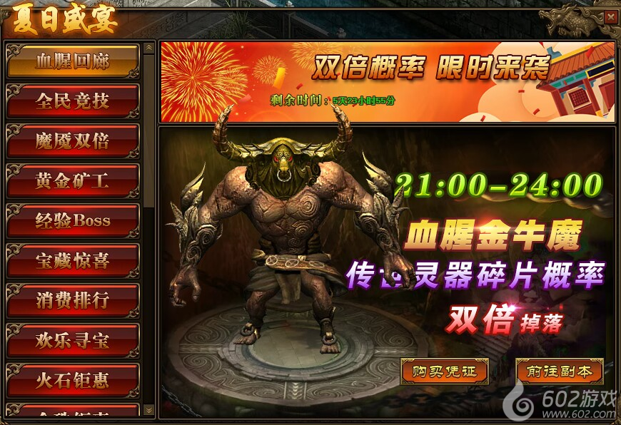 1.活动期间,玩家参与“多人副本-血腥回廊”,获得“传世灵器碎片”的概率翻倍;