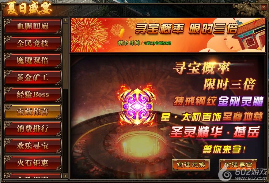 .活动期间,玩家寻宝概率翻倍,极高几率获得星·太初首饰,传世灵器、传世灵甲,特戒钢纹,仙元石、碧落星空,传世灵器、传世灵甲,金刚灵髓、金刚精华,至尊风扬阵法以及圣灵精华(撼岳);