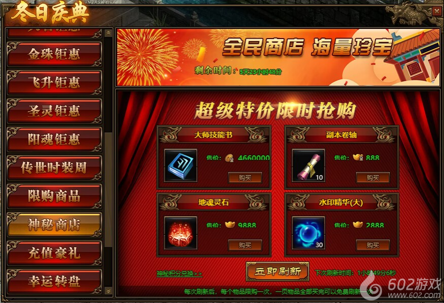 2.神秘商店每2小时自动刷新一次,也可用花费元宝立即刷新;
