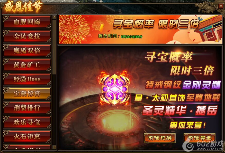 .活动期间,玩家寻宝概率翻倍,极高几率获得星·太初首饰,传世灵器、传世灵甲,特戒钢纹,仙元石、碧落星空,传世灵器、传世灵甲,金刚灵髓、金刚精华,至尊风扬阵法以及圣灵精华(撼岳);