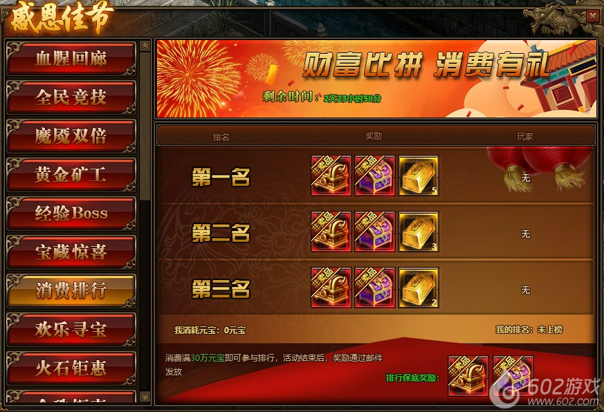 1.活动期间,玩家消费满30万元宝参与排行