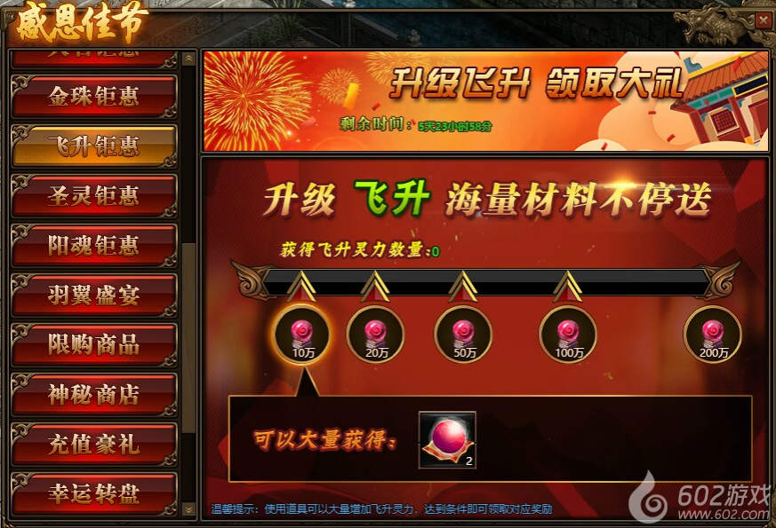 1.活动期间,玩家获得飞升灵力碎片数量,达到条件可领取对应飞升灵力奖励。