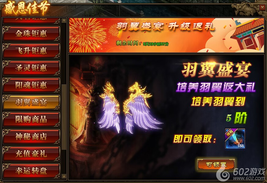 1.活动期间,玩家羽翼只需达到5级,即可领取一定数量的羽毛;